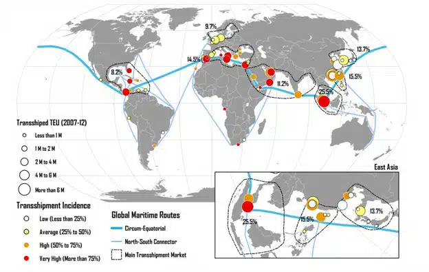 Transshipment often occurs at the intersection of shipping routes and at straits such as the Panama Strait, Suez, and Gibraltar. The map below shows that these centers are located along the main sea route around the equator. These routes are specifically used for Asia-Middle East-Europe trade. Major transhipment hubs usually have a slight maritime deviation from the main shipping lanes, and many of them provide connections or intersections between north-south and east-west shipping lanes.